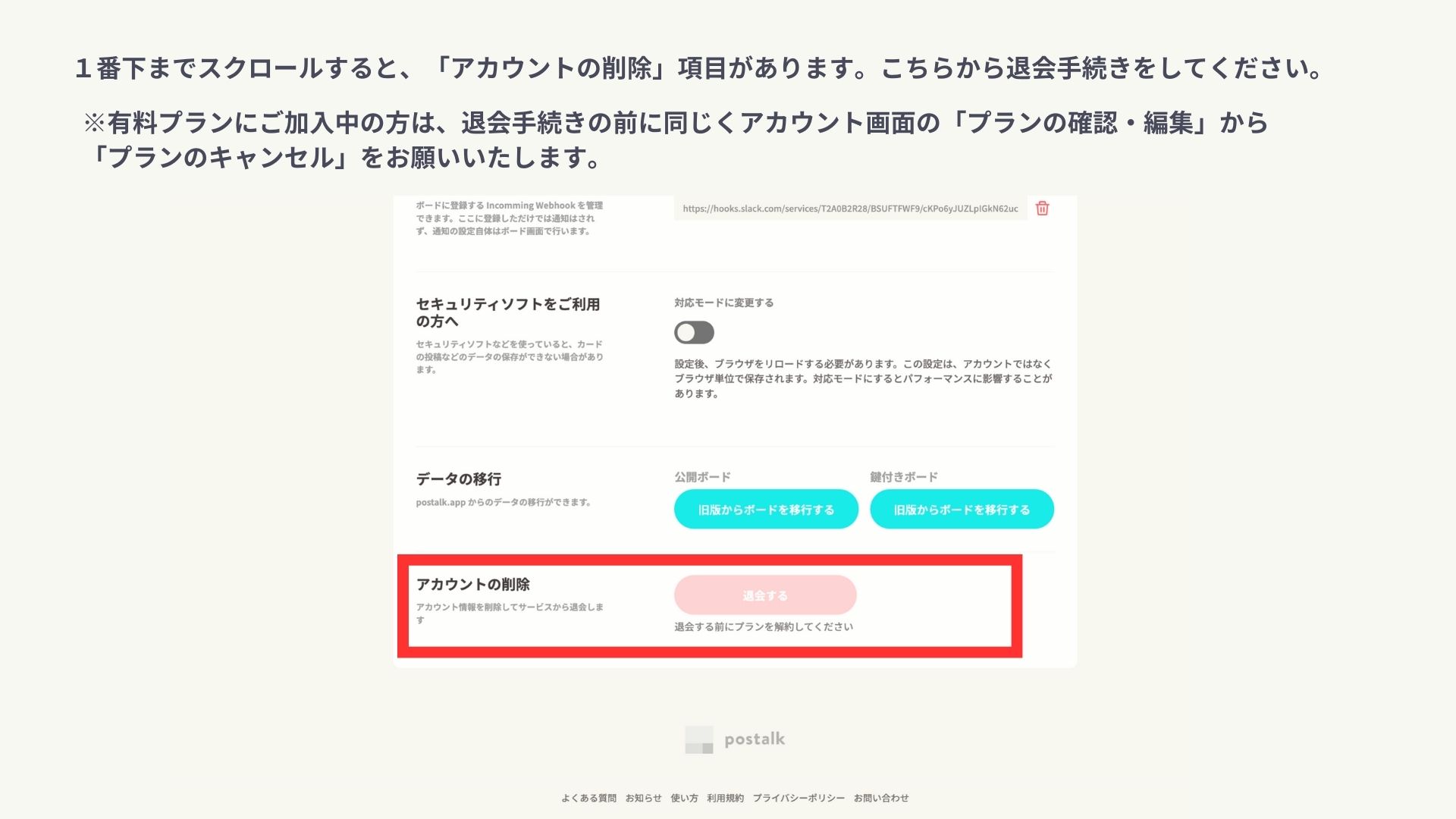 1番下までスクロールすると「アカウントの削除」項目があります。こちらから退会手続きしてください。有料プランにご加入中の方は、退会手続きの前にプランの解約をお願いします。